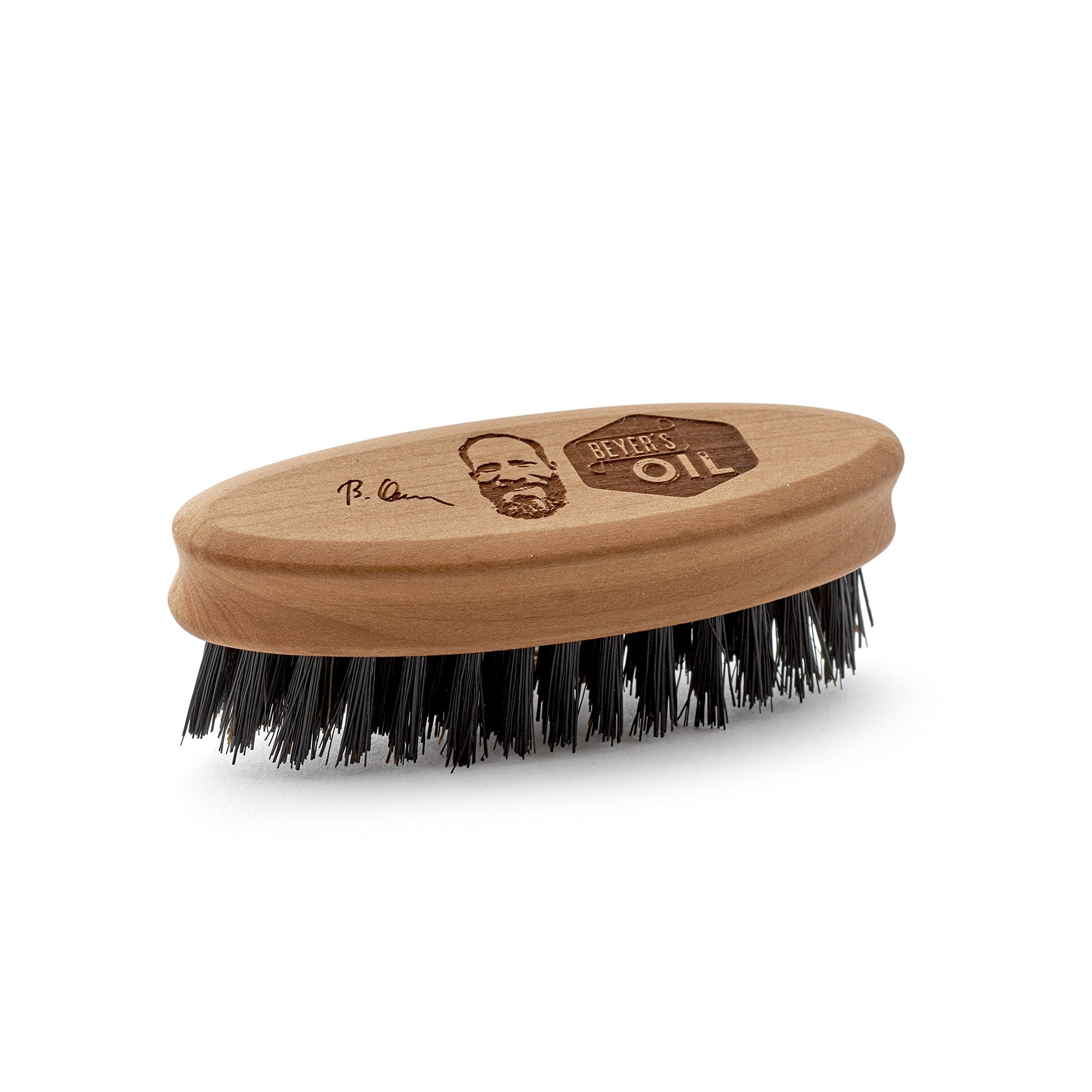 - Beyer’s Oil Bartbürste (90 x 28 mm): Bringt die Barthaare in Form, massiert die Haut und regt die Talgproduktion an. Entfernt alte Barthaare für einen glänzenden Bart.