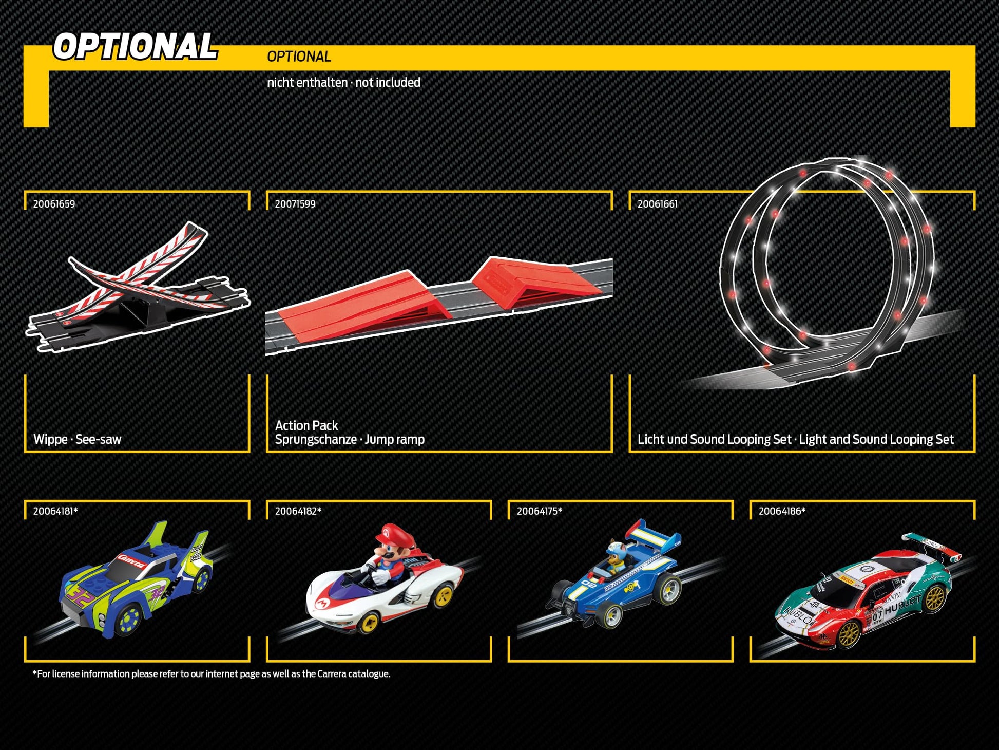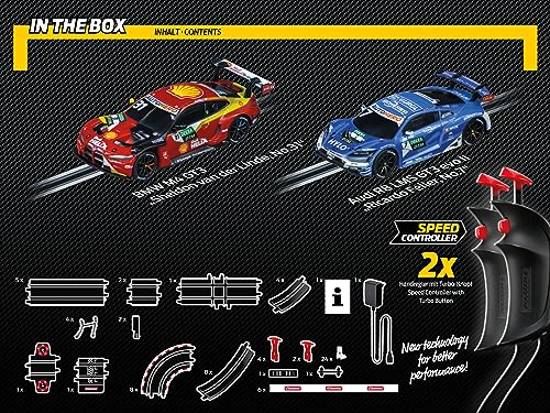 Beschreibung: Rase mit dem Champion-Auto von Sheldon van der Linde (BMW M4 GT3 Nr. 31) und dem Ferrari 488 GT3 “Red Bull AF Corse Nr. 30” über 63 Meter High-Speed-Strecke im Maßstab 1:43. Zwei Handsteuerungen mit integriertem Turbo-Boost und ein digitaler Rundenzähler sorgen für packende Rennaction.