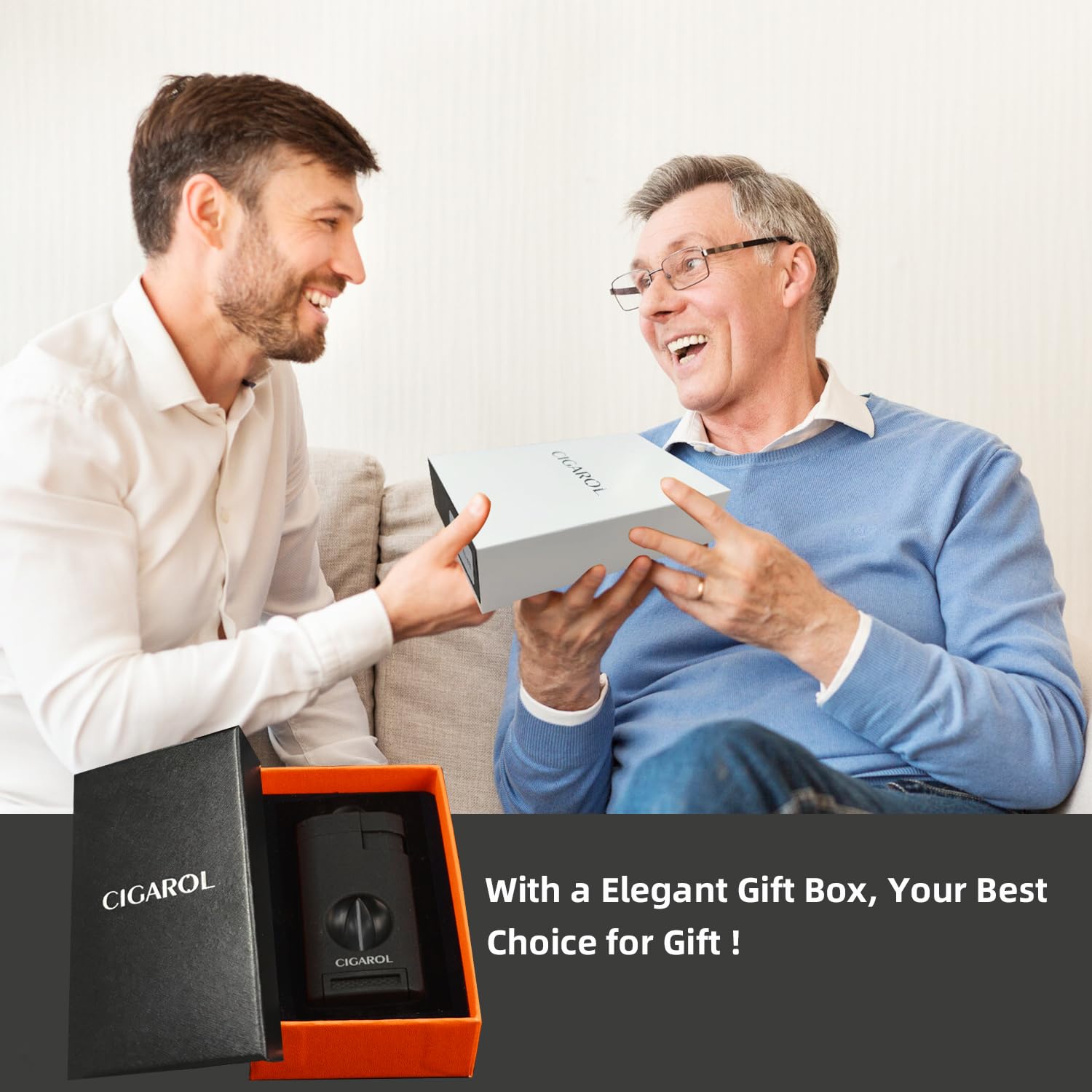 CIGAROL 3-in-1 Zigarrenfeuerzeug mit V-Cutter, 3-fach Jetflamme und edler Geschenkbox. Sturmfestes Design (ohne Gas) für präzises Anzünden und sauberes Schneiden. Hochwertiges Zigarrenzubehör und stilvolles Geschenk für Genießer.