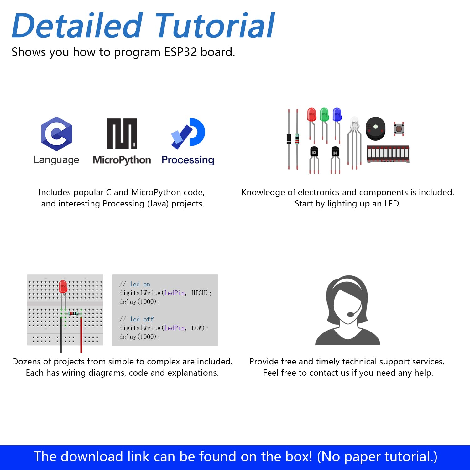 Freenove Ultimate Starter Kit mit ESP32-WROVER CAM, Dual-Core-Mikrocontroller, integrierter Kamera & WLAN. Enthält 240 Bauteile, 122 Projekte und ein 795-seitiges Tutorial für Python, C & Java. Für ambitionierte Elektronik- und Programmierideen.