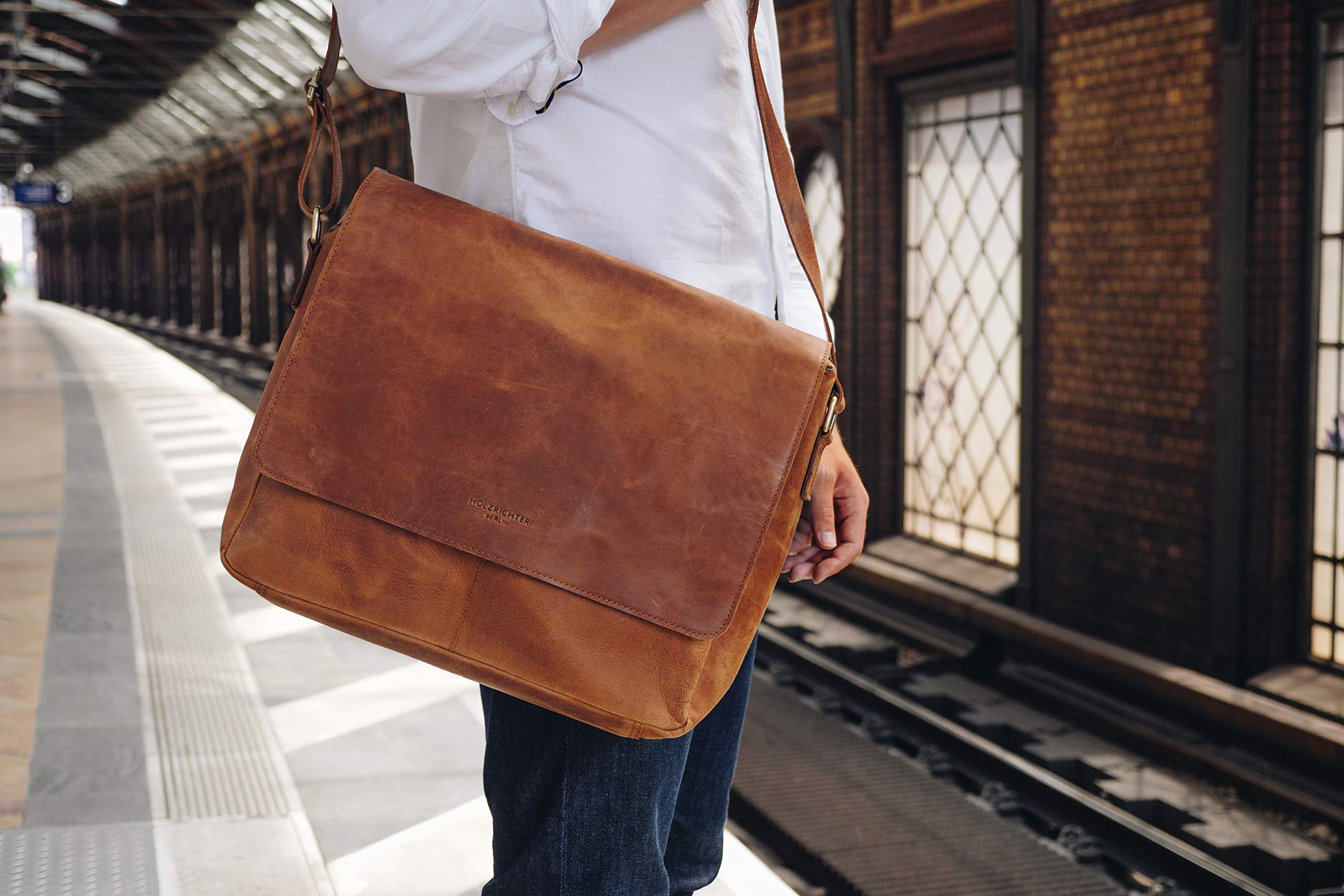HOLZRICHTER Berlin Umhängetasche (M) aus handgefertigtem Premium-Leder in Camel-Braun – klassische Messenger Bag im zeitlosen Vintage-Design. Für Männer die Stil, Qualität und Funktion schätzen. Ideal für Alltag und Business.