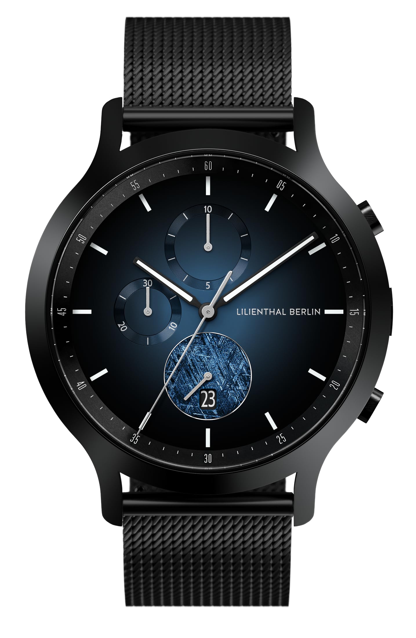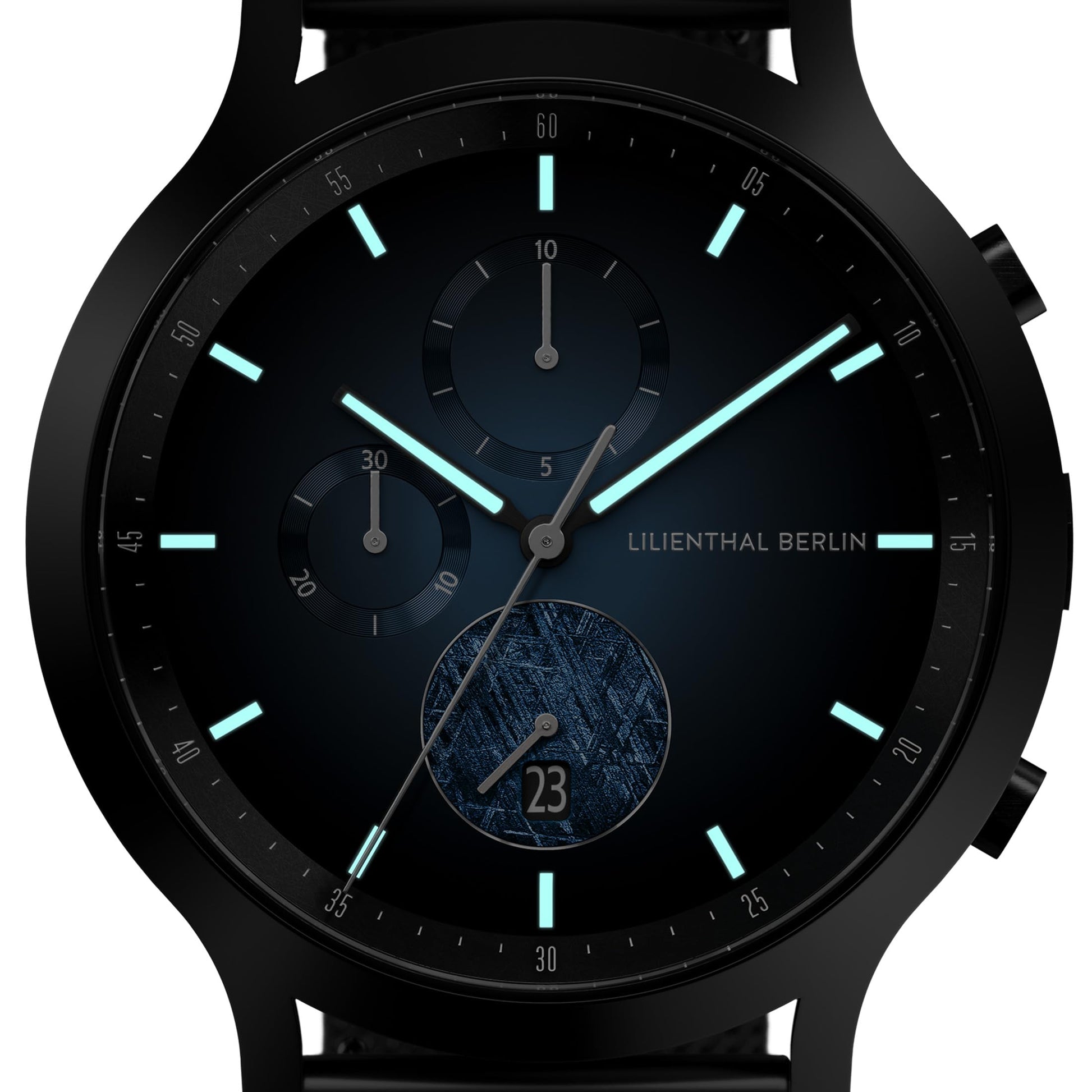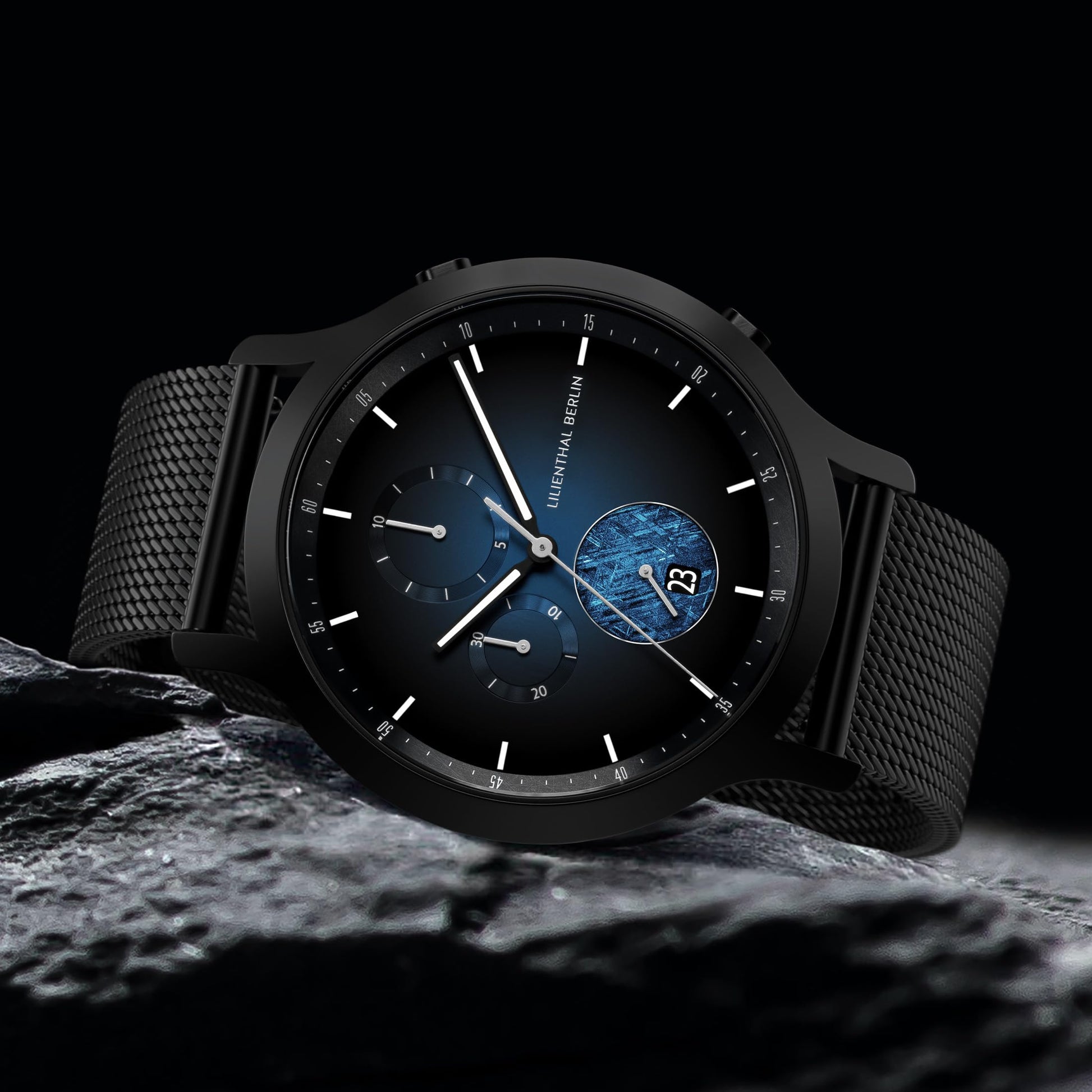 Lilienthal Berlin Chronograph Meteorite IV (42,5 mm, schwarz). Exklusive Herrenuhr mit Meteorit-Zifferblatt, Mesh-Armband und saphirgehärtetem Mineralglas – robust und einzigartig. Jetzt entdecken und himmlisch präzise Zeit erleben.