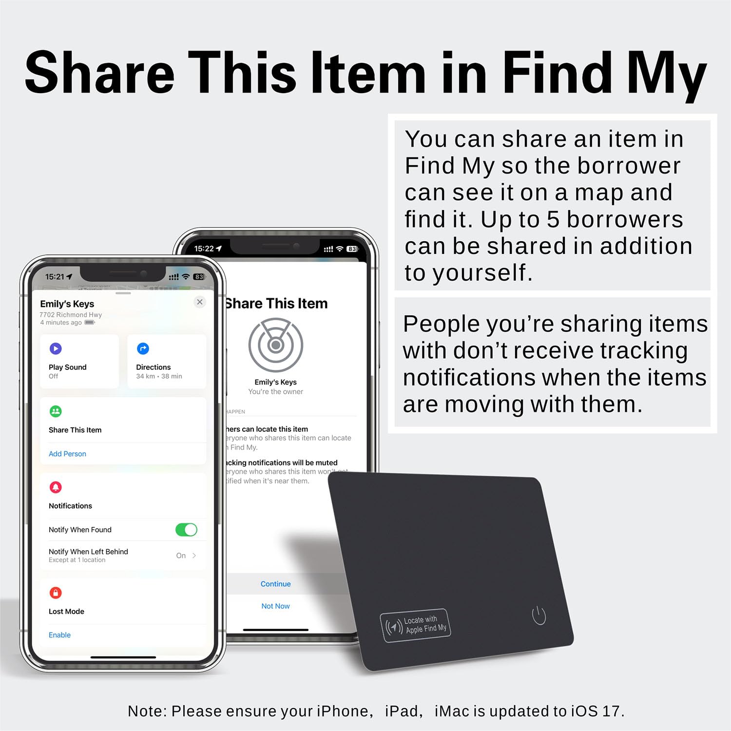 Mit dem Trennungsalarm wirst du benachrichtigt, wenn deine SmartTrack-Karte außerhalb der Bluetooth-Reichweite ist, und über die „Mein Gerät suchen“-App kannst du den letzten Standort deines Trackers einsehen.