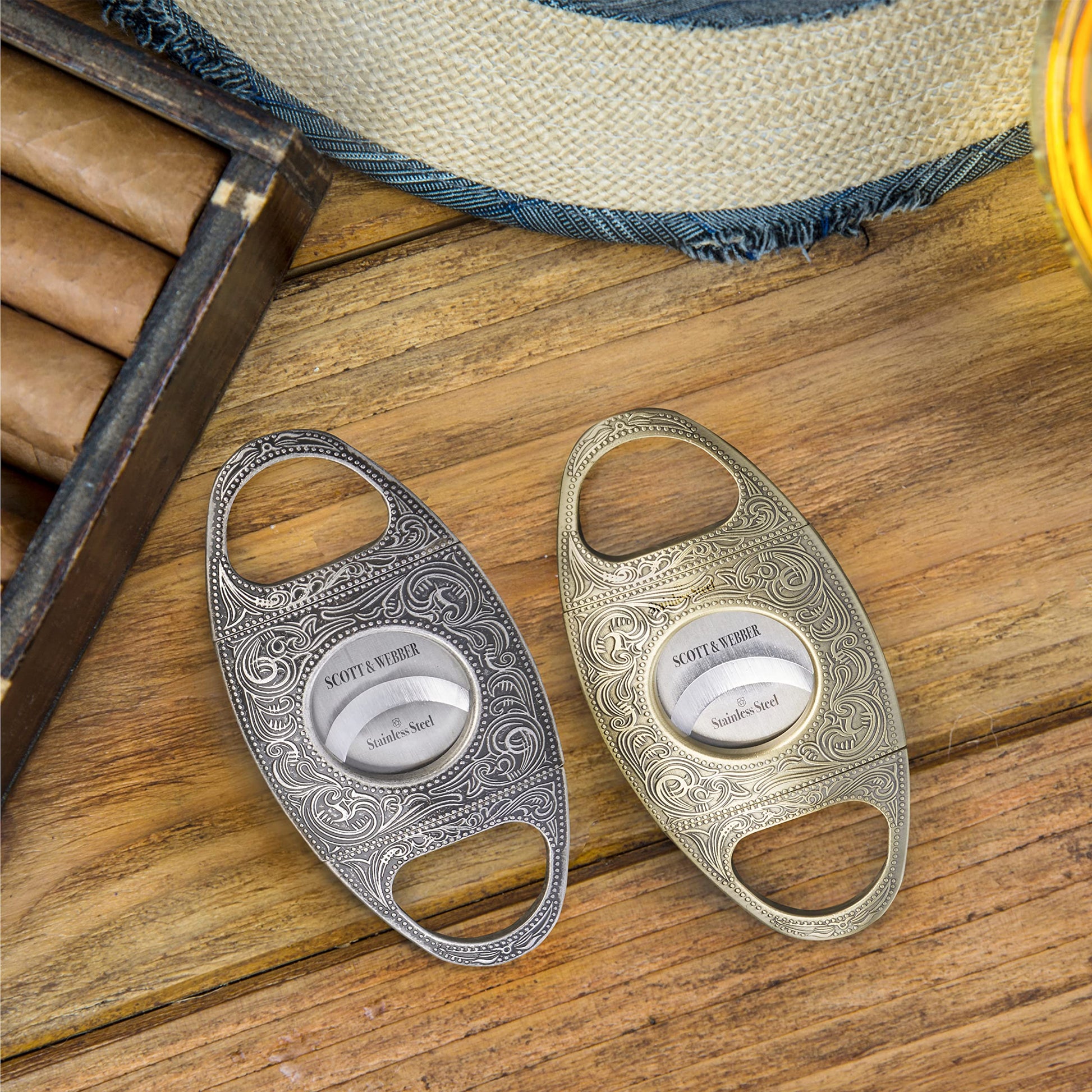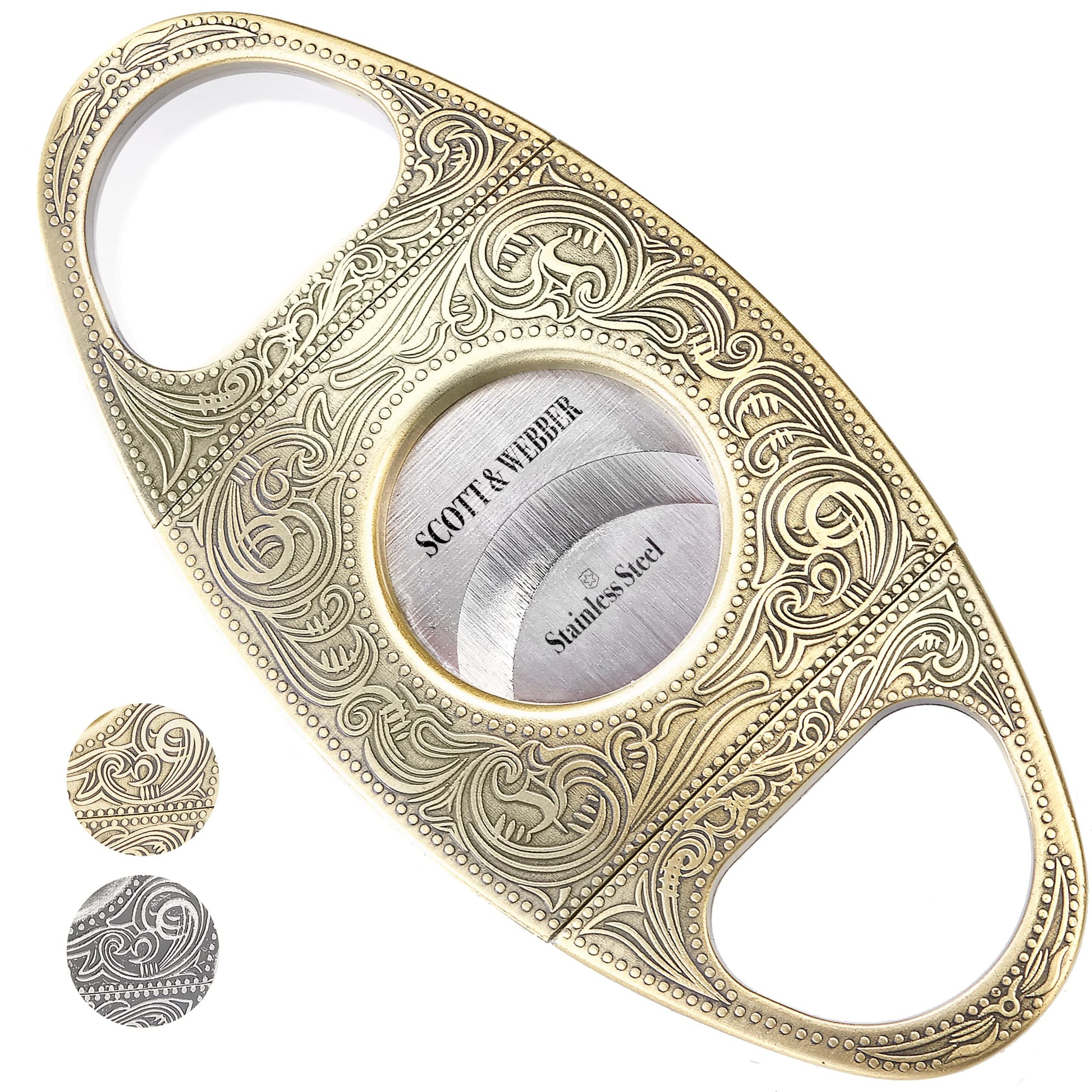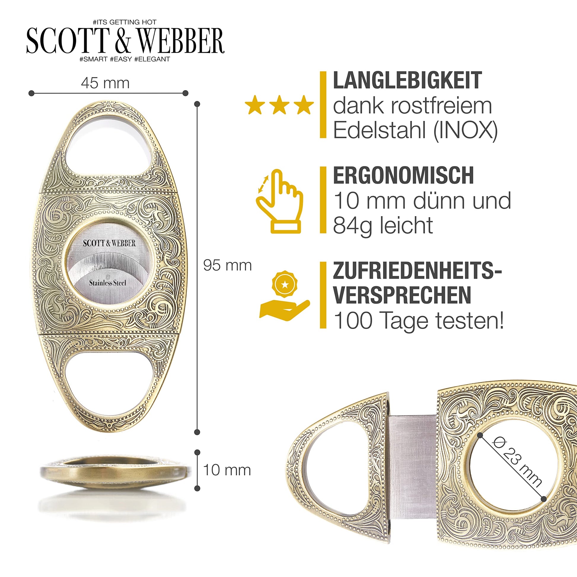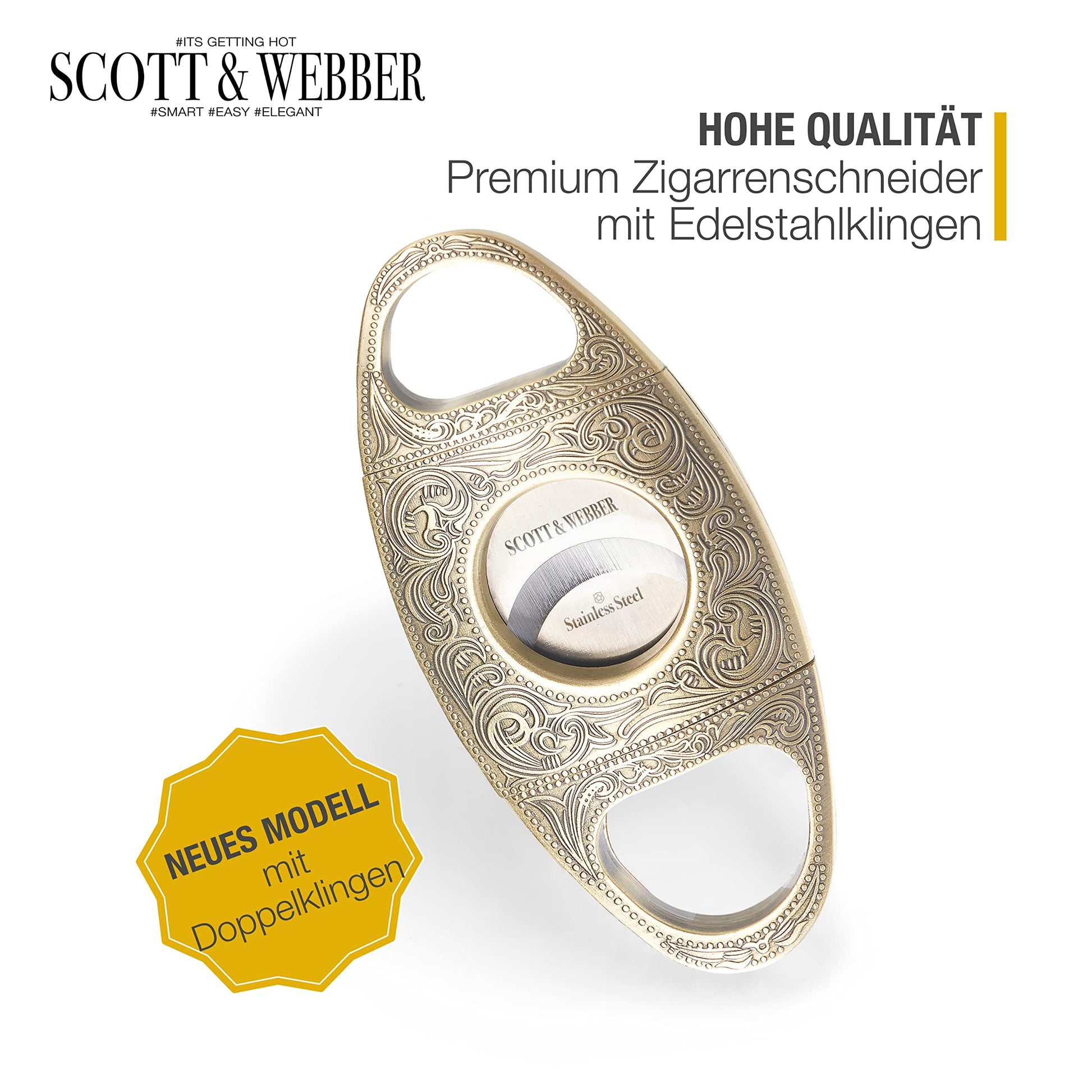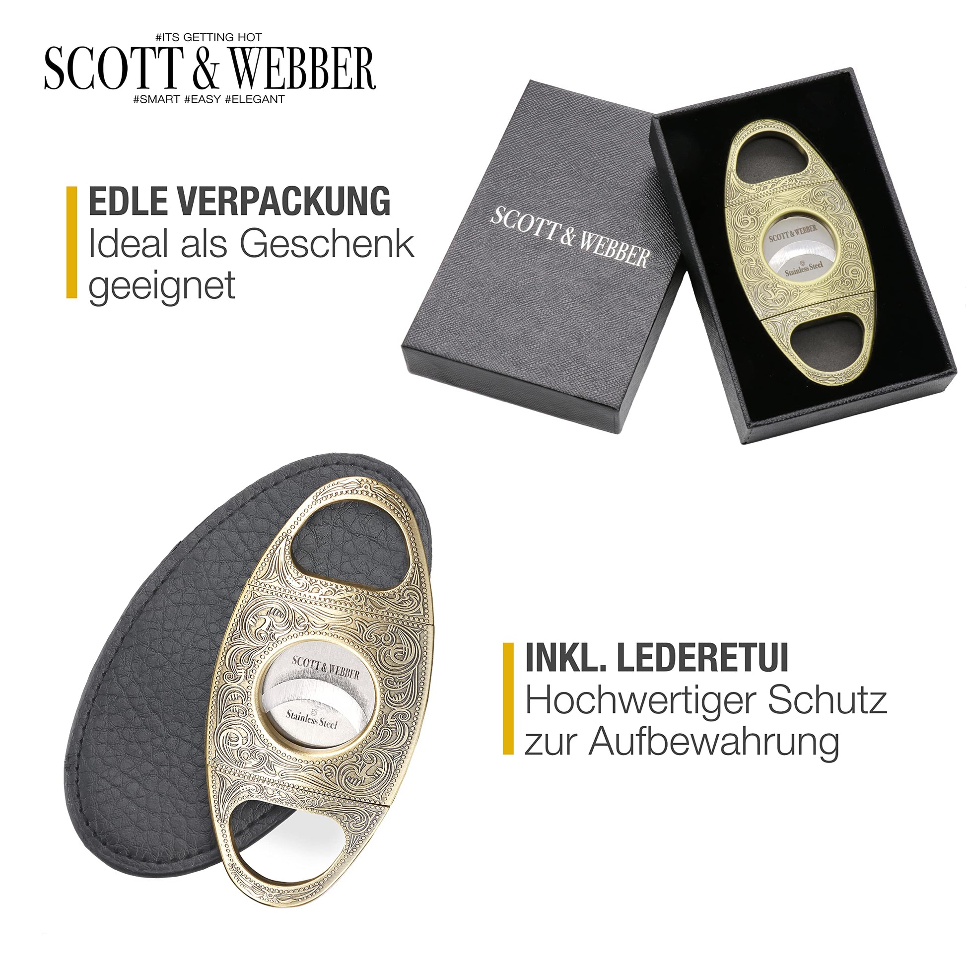 Scott & Webber® Zigarrenschneider mit doppelschneidiger Edelstahlklinge für große Ringmaße. Inklusive edlem Lederetui und Geschenkverpackung in Gold/Bronze. Stilvolles Zubehör für anspruchsvolle Zigarrenliebhaber.