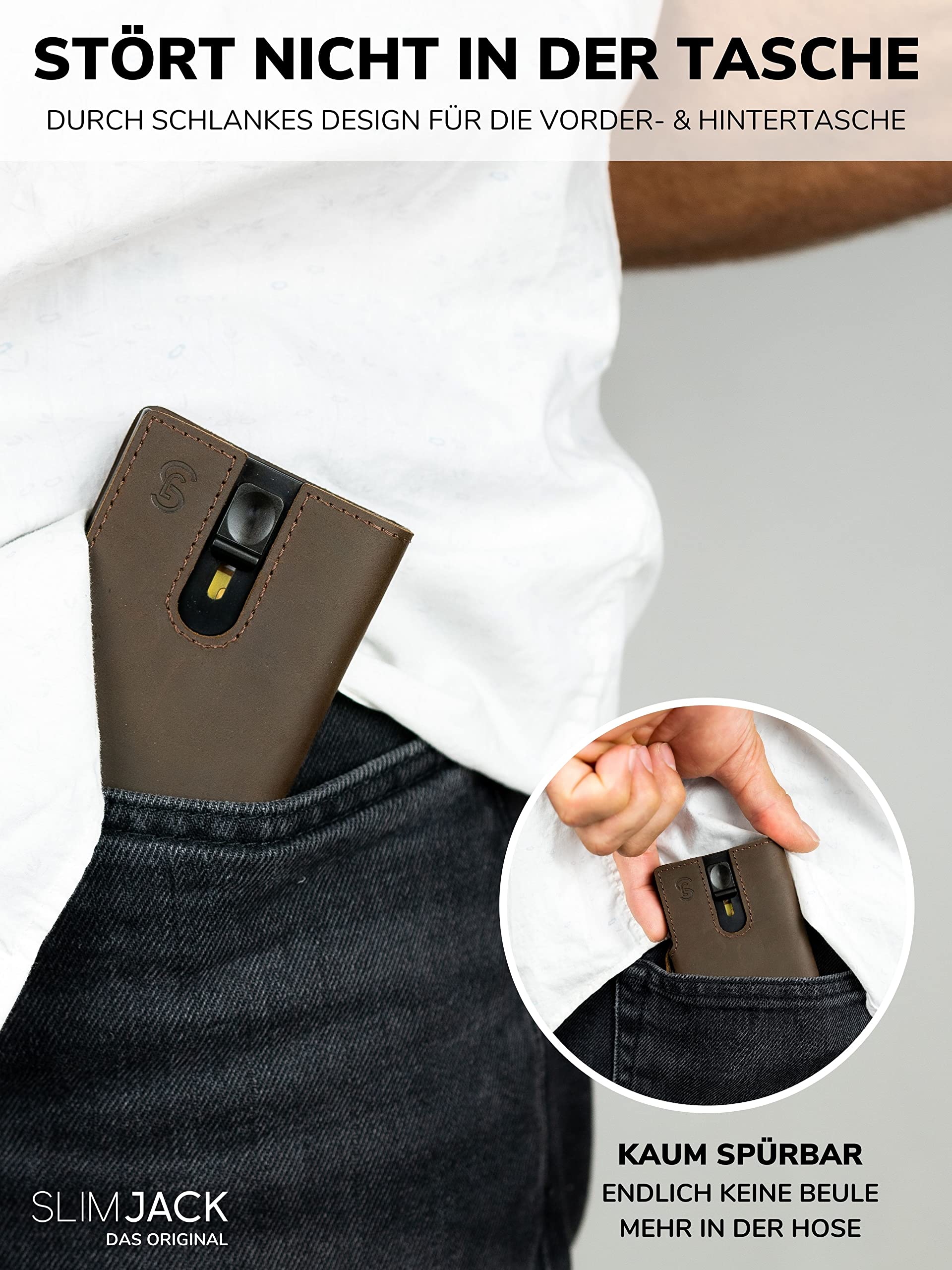 SLIMJACK Smart Wallet in Dunkelbraun – RFID-geschütztes Kreditkartenetui mit Aluminium-Kartenhalter und integriertem Münzfach. Kompakt, sicher und edel im Design. Für Männer, die Stil und Funktion in der Hosentasche tragen wollen.