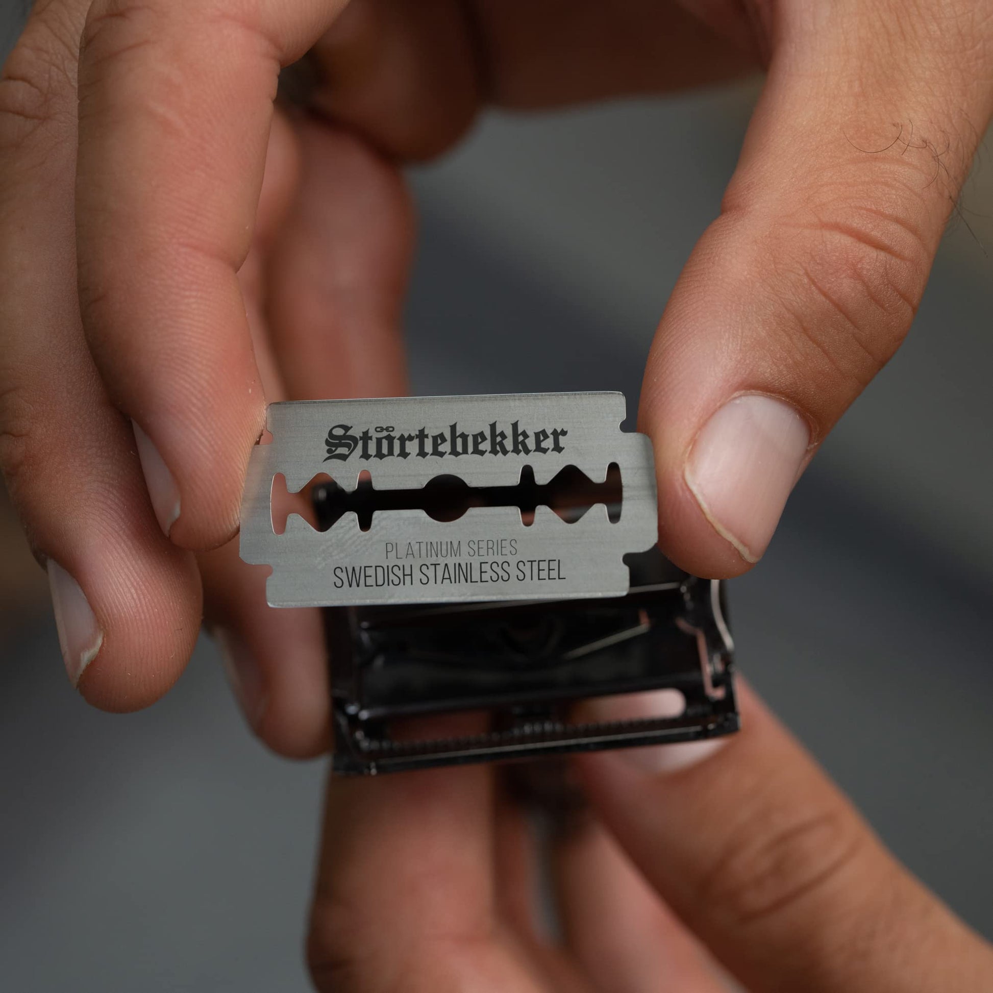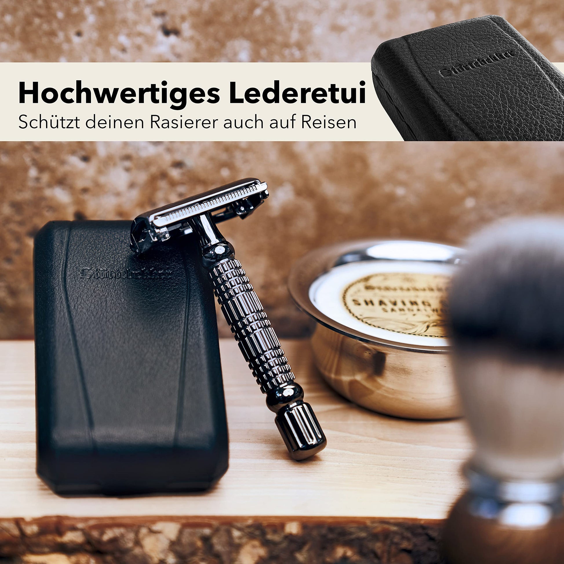 Gentleman Essential Set: Das Set enthält den Störtebekker Rasierhobel Schwarz mit 10 Rasierklingen, ein Rasierpinsel Set mit Sandelholz Seife, einen Alaunstein und einen Gratis Rasierständer.