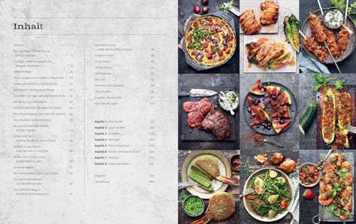 - Vielfältige Rezepte: Fleisch, Fisch, Gemüse, vegetarisch, vegan, süß, gebacken, geschmort und geräuchert